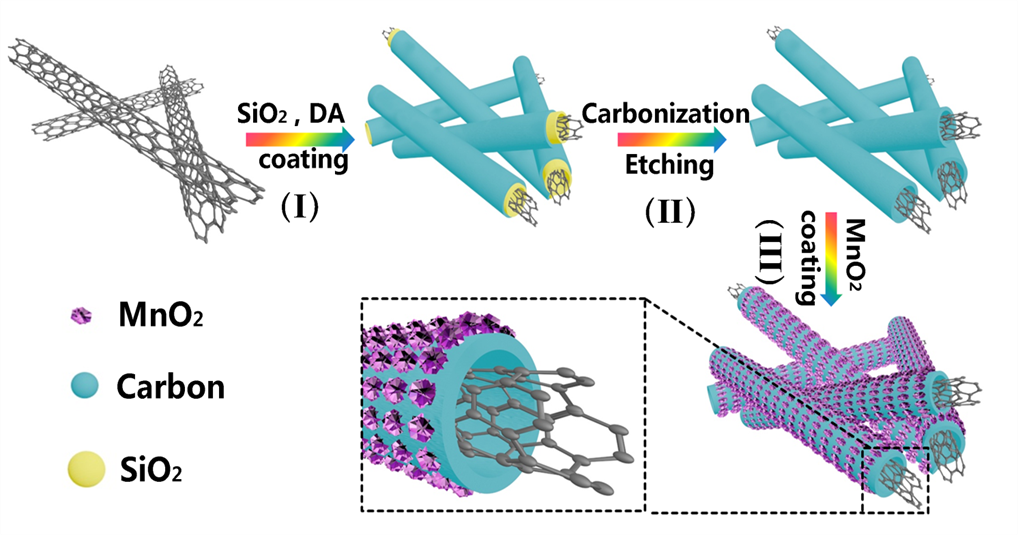最近,我院低维材料与清洁能源创新型科技团队以碳纳米管(CNT)为基本骨架,通过模板法,以多巴胺为碳源和氮源,在模板二氧化硅的表面包覆了一层多孔碳层,最终构建出了双层中空碳管,经过冷冻干燥和水热等过程,成功制备出双层中空碳管与超薄二氧化锰片的复合材料(CNT@NCT@MnO2)。