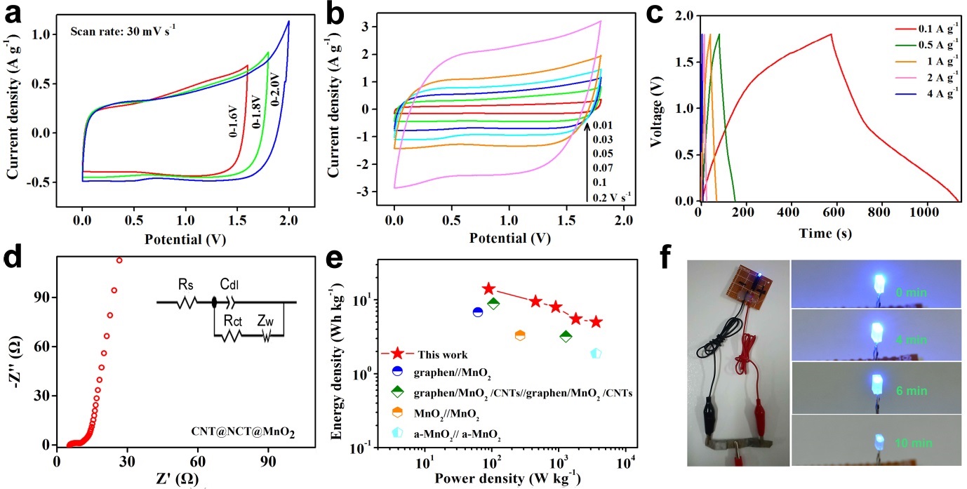 研究发现,CNT@NCT@MnO2应用于超级电容器方面时,具有较大的优势:该复合材料主要有以下几个方面的优点:(1)随着微观三维碳导电网络的建立,MnO2复合材料的电荷传递速度加快,导电性能提高;(2)双层中空碳层为电子提供了连续的扩散途径,内部空隙为离子与碳提供了大量的有效接触位点,有利于碳材料对离子的吸附,从而大大提高了EDLC;(3)超薄MnO2纳米片在多孔碳管表面生长,具有较高的比表面积,有利于法拉第氧化还原反应。因此,CNT@NCT@MnO2作为超级电容器电极材料具有很大的优越性和良好的应用前景。最后,作者也通过机理分析发现,作为超级电容器的电极材料,该三维碳结构网络对离子和电子具有较迅速的传输作用,并使电容器表现出快速氧化还原反应的特性。
