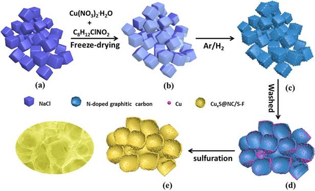 最近,我校低维材料与清洁能源创新型科技团队以氯化钠晶体为模板、盐酸多巴胺为碳源和氮源、硝酸铜为铜源,经过冷冻干燥和高温还原等过程,成功制备出铜和氮共掺杂的三维多孔石墨化碳网络复合材料(CuxS@NC/S-F)。研究发现,当CuxS@NC/S-F应用于锂硫电池方面时,具有较大的优势:I)三维多孔碳结构有利于电荷转移和电解质的浸润;II)具有良好导电性的硫化铜可以与锂反应,在锂硫电池电压范围内贡献部分容量;III)硫分子在CuxS中的分散提高了活性物质的利用率,并且Cu作为放电产物有利于提高电极整体导电性;IV)CuxS材料可以作为催化剂减少放电产物(Li2S)在电极表面的不可逆沉积。因此,CuxS作为锂硫电池的硫基质具有很大的优越性和良好的应用前景。最后,作者也通过机理分析发现,作为锂硫电池的硫基质材料,该掺杂网络对聚硫化物具有高效的催化作用,并使电池表现出快速氧化还原反应的特性。
