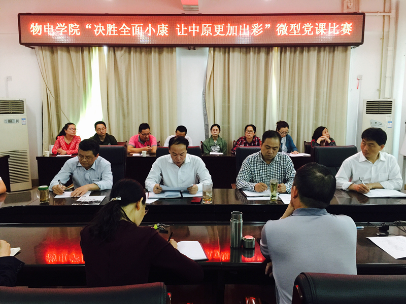 5月16日,物电学院“决战全面小康,让中原更加出彩”微型党课比赛在理科楼911会议室举行。学院党委书记柳士刚、副书记李刚、院长孙宜海、仓玉萍及教工党员参加了比赛。