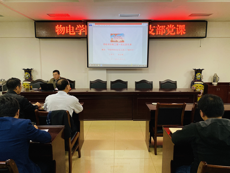 根据《物电学院“不忘初心、牢记使命”主题教育方案》安排,10月8日,学院教工第一党支部在理科楼511会议室开展主题教育专题党课,党课题目为《解读“中国特色社会主义进入了新时代”》,党课由学院党委委员、副院长孙宜海主讲,学院教工第一党支部党员聆听了党课。