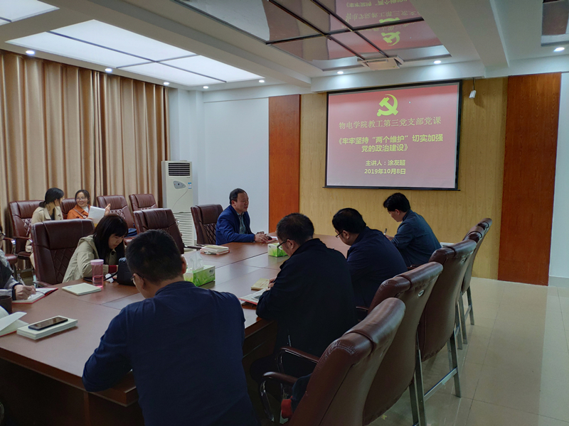 根据《物电学院“不忘初心、牢记使命”主题教育方案》安排,10月8日,学院教工第三党支部在理科楼911会议室开展主题教育专题党课,党课题目为《牢牢坚持“两个维护”,切实加强党的政治建设》,党课由学院党委委员、院长涂友超主讲,学院教工第三党支部党员聆听了党课。