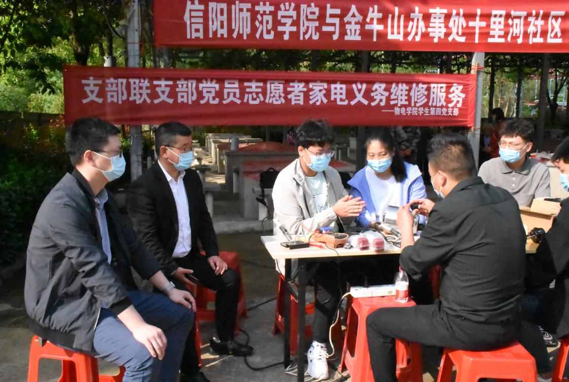 为更好发挥支部战斗堡垒作用、提升党员干部能力作风,践行全心全意为人民服务的宗旨,4月23日,物电学院学生党支部与金牛山办事处十里河社区党支部在金牛山文化公园开展“支部联支部”党员志愿者家电义务维修活动。金牛山办事处十里河社区党支部书记张俊峰、物电学院学生第四党支部书记张康华和两个党支部的党员参加了活动。