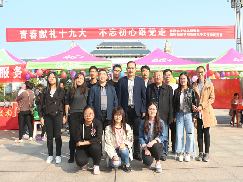 为发扬党的十九大会议精神,鼓励学子们积极将理论知识投身社会实践,10月28日,williamhill中国“青春献礼十九大,不忘初心跟党走”社团联合活动于信阳市茗阳阁广场顺利开展。本次活动由williamhill中国分团委主办,爱心学校协会、雅轩棋社、羽毛球协会、大学生创客联盟、电子信息技术协会、星空物语天文观测协会共同承办。我院党委副书记李刚,社团指导老师冀晓群、李长庚亲临现场,为活动顺利开展做具体指导。
