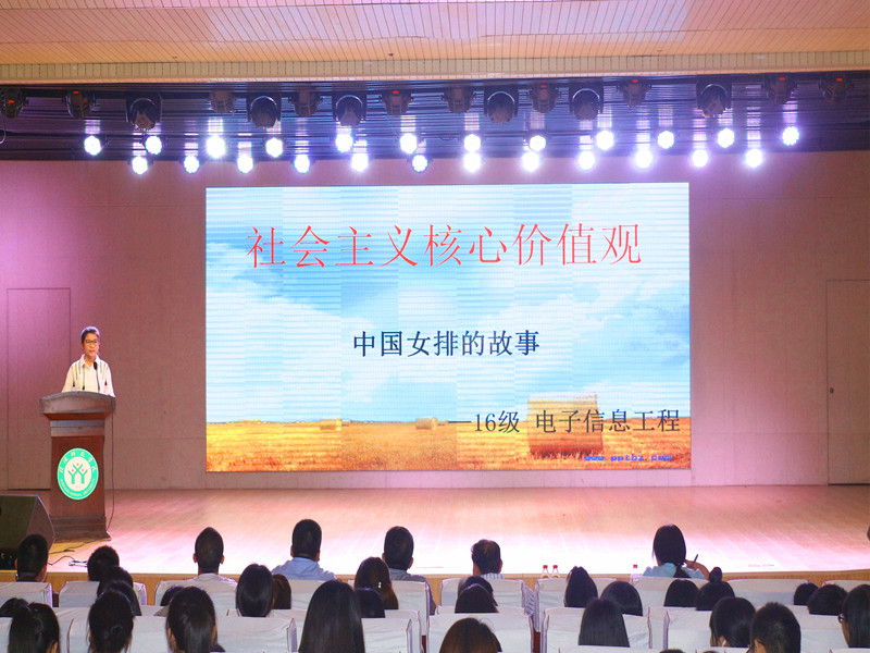 为大力推进社会主义核心价值观教育,培育和弘扬社会主义核心价值观,5月26日晚上,物电学院“讲价值观故事 实现青春梦想”主题教育活动决赛在理科楼多功能厅顺利开展。校党委宣传部理论科科长李东晓,校团委副书记邱洋,校学工部教育科科长李明,我院党委书记柳士刚,党委副书记李刚,副院长孙宜海,党委秘书张康华,思想政治教研室主任张彦飞,办公室主任周理海,辅导员黄钰莹等领导老师莅临现场担任比赛评委,与我院500余名学子共同观看比赛。