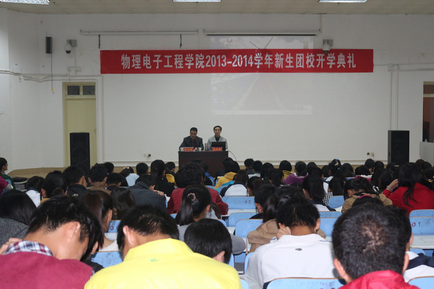 为发挥基层团组织在思想政治教育工作中的作用,培养当代大学生积极向上的思想意识, 10月29日晚,在人文楼报告厅隆重举行物电学院2013—2014学年新生团校开学典礼,校团委副书记武治国受邀为2013级全体新生作专题报告。典礼由党总支副书记刘百超主持。