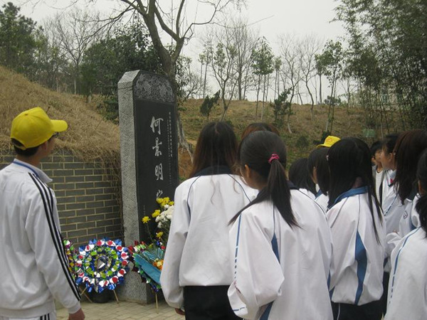 上午8时活动参与人员集合完毕,由主持人介绍了活动的各项注意事项。接着张康华致辞,他简要的介绍了何景明的一生,赞扬了他刻苦好学、廉洁公正的高尚品质,并希望同学们通过此次扫墓活动,继承发扬老一辈的优良传统和高尚品德。随后参与人员按秩序入场,在解说员的带领下来到景明墓前,由学生代表向先辈敬献鲜花,全体人员列队鞠躬致敬。
