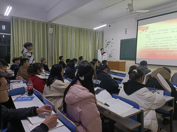 为增强大学生依法履行兵役义务的意识,推动我院大学生征兵工作,确保高标准高质量完成本年度大学生兵员征集任务。12月14日,我院在教二梯四、教三05、教三06开展大学生应征入伍宣传动员工作。此次宣传动员工作由赵自依主持,徐庚琛主讲。