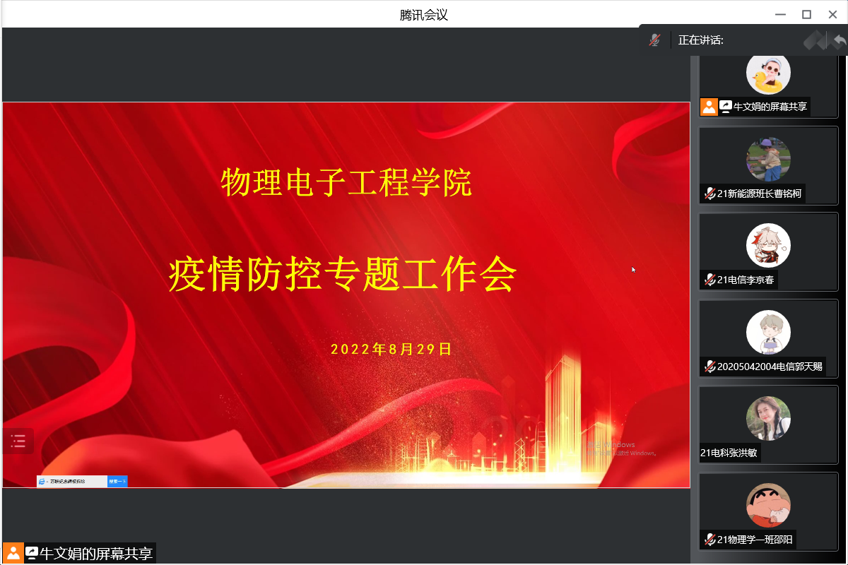 召开疫情防控专题会。根据《信阳师范学院2022年秋季学期开学工作方案》,结合我院实际情况,我院于8月29日召开疫情防控线上专题工作会,学生会干部、各班班长参会。会上,团委老师牛文娟向同学们传达并解读了《信阳师范学院2022年秋季学期本专科学生返校报到须知》,党委副书记张丽就如何做好学生开学返校的疫情防控工作进行安排部署,确保学生能够顺利、平安返校。