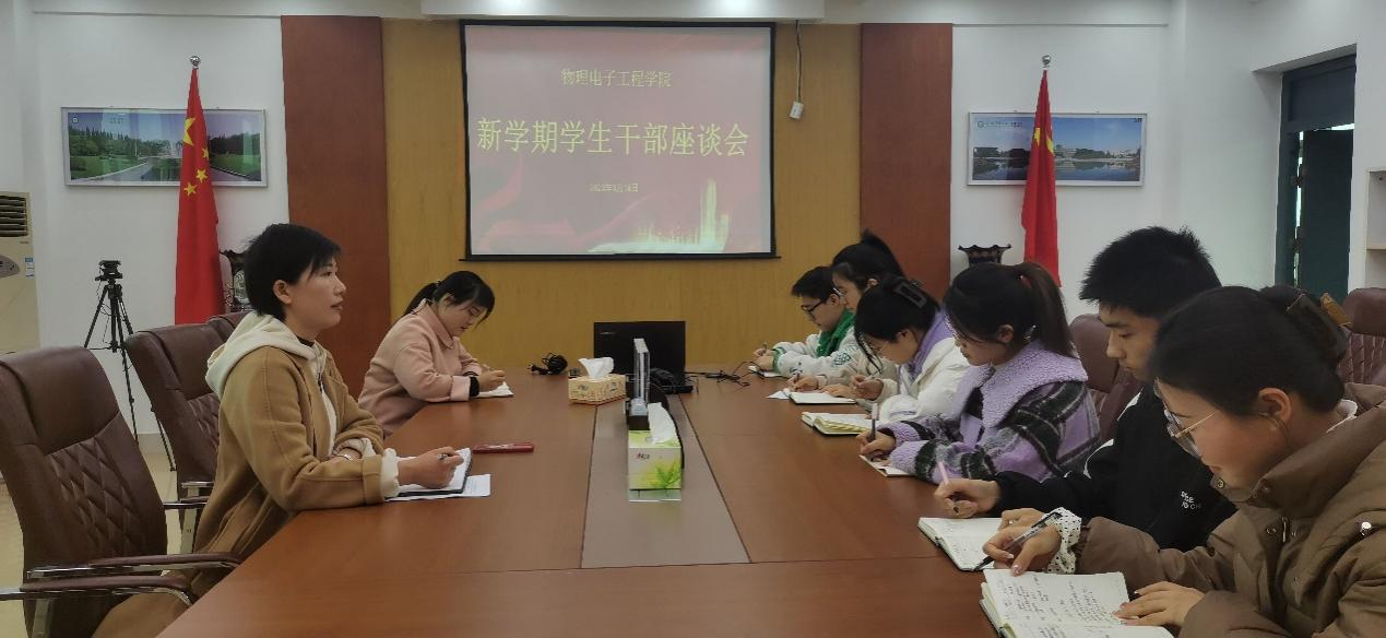为进一步了解青年学生的思想动态,充分发挥学生干部的带头作用,营造和谐向上的校园文化氛围。3月16日,我院于理科楼911会议室举行学生干部座谈会。党委副书记张丽,团委老师牛文娟,团委副书记李雪峰,学生会主席团成员参加此次会议。