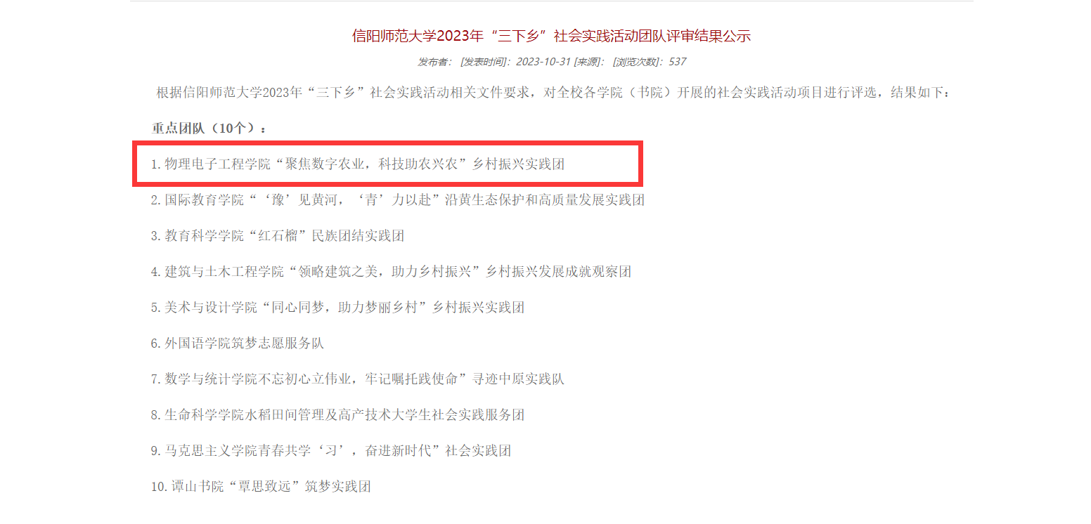 近日,williamhill体育中文2023年“三下乡”社会实践活动评审会公布评审结果,我院的“聚焦数字农业,科技助农兴农”乡村振兴实践团被评为重点团队。