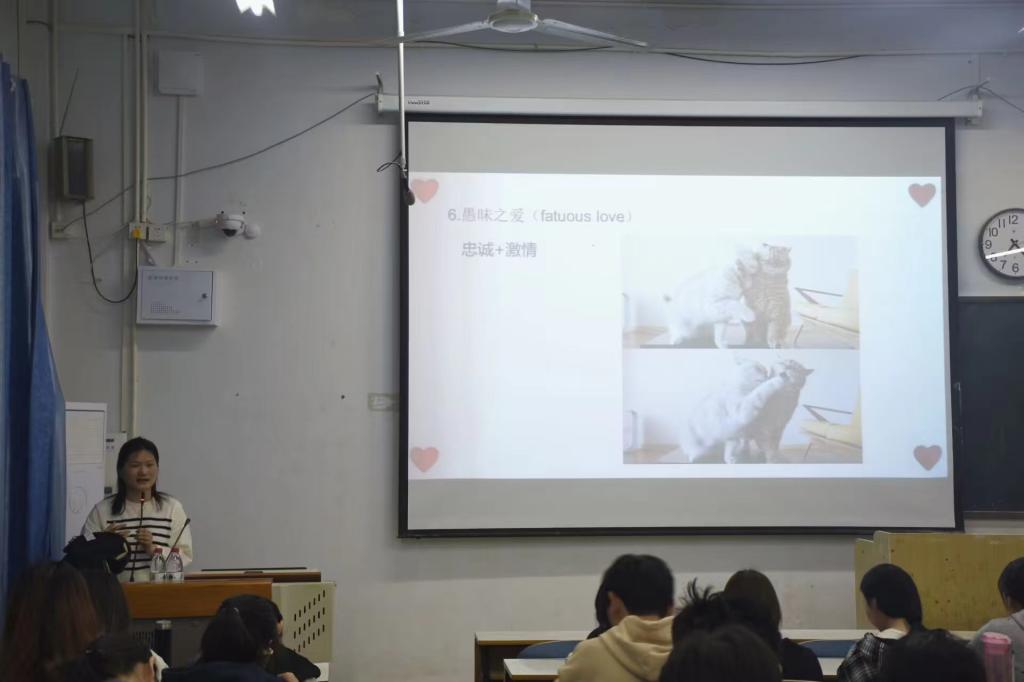 虞老师以“什么是爱情?”这一引人深思的问题开场,迅速引起了同学们的共鸣。随后,她通过生动的案例和深入浅出的讲解,向同学们阐述了正确的爱情观。虞老师强调,爱情不仅仅是肉体上的亲近,更重要的是心灵上的契合和共同成长。虞老师还从心理学的角度解读了好的爱情所具备的特质,她结合斯滕伯格的爱情三元理论,详细解析了爱情中的八种关系组合,帮助同学们更好地理解和区分喜欢与爱之间的微妙差别,以及完满之爱在恋爱中的重要性。