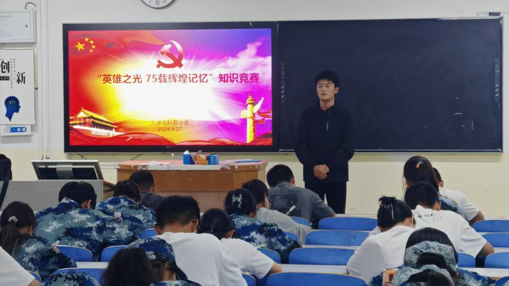 为庆祝中华人民共和国成立七十五周年,激发学生的爱国热情,9月26日,我院在教三205成功举办“英雄之光•75载辉煌记忆”知识竞赛。本次活动由大学生科普协会精心策划并组织实施,2024级学生积极参与。