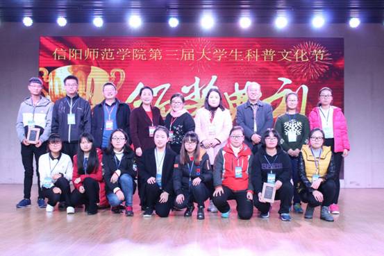 精彩的歌唱表演之后,各位评委老师分别为获得本届大学生科普文化节“十佳科普大使”、“优秀科普志愿者”、“科普知识竞赛一、二等奖”队员及“优秀选手”颁发了奖品和证书,并合影留念。