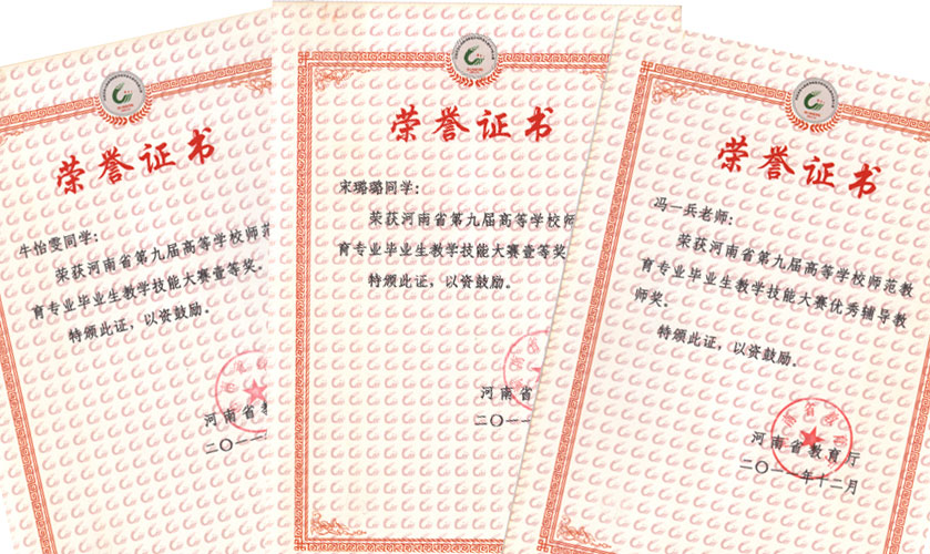 近日,河南省教育厅公布了《河南省第九届高等学校师范教育专业毕业生教学技能大赛结果》,并颁发了获奖证书。我院选派的两名2008级物理学专业学生牛怡雯、宋璐璐双双获得一等奖,指导教师冯一兵获优秀辅导教师奖。