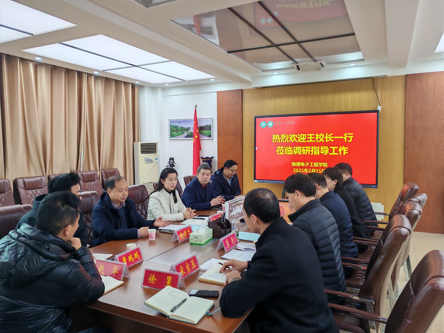 2月15日下午,副校长王娟带领教务处处长李宝峰、教育教学评估中心主任余国忠、教务处副处长周学勇及教务处综合管理科科长曹鹏鹏一行5人莅临我院,就春季教学和电子信息工程专业认证工作进行调研与指导。学院分党委书记方明科、院长龚克、分党委副书记张丽、副院长刘墨林、副院长宋宣玉、电子科学技术系主任赵华及教学秘书徐昱参加座谈。会议由方明科主持。