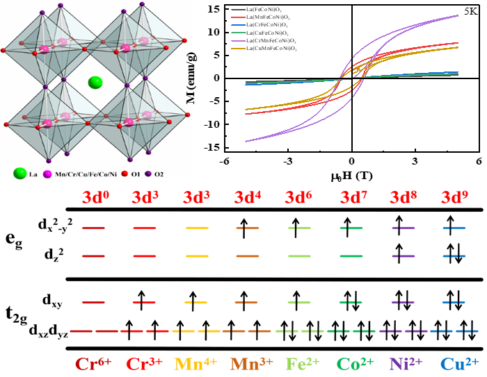 近年来,高熵钙钛矿氧化物凭借结构可调、性能丰富等优势,是磁功能材料领域的研究前沿与热点。该课题组采用熵工程策略与自生成牺牲碳模板法,成功制备出超薄镧基高熵钙钛矿氧化物纳米片,构建出低熵、中熵、高熵系列样品。通过对 B 位多种3d 过渡金属阳离子进行精准取代与价态调控,系统研究了多阳离子取代对材料晶体结构、电子态与磁性能的影响规律,为新型磁功能材料的定向设计提供了理论与实验依据。
